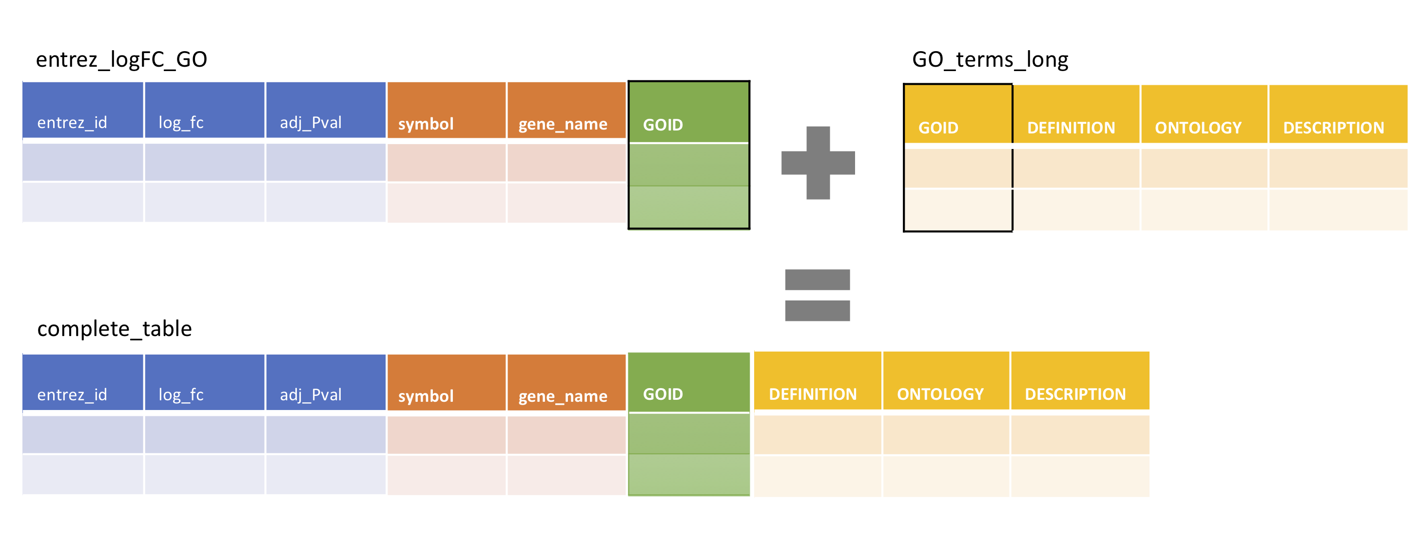 Our first task is to join the the entrez_logFC results table with the gene annotations in Hs_entz_annot_tidy. We will use the joint key ‘entrez_id’ (outlined in black).