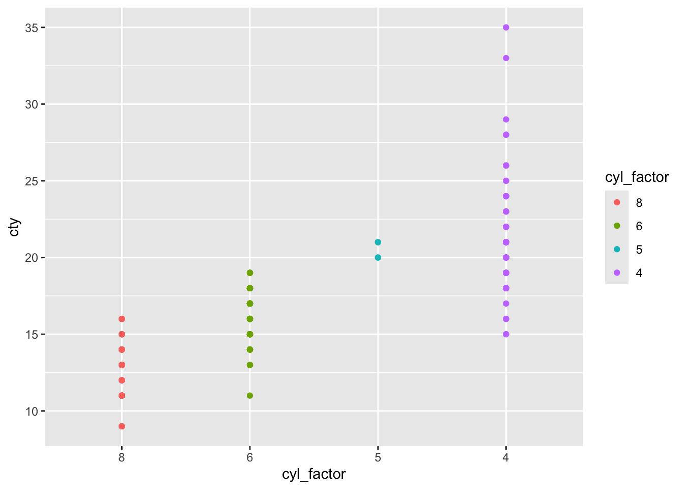 Now the colour scale is divergent, or discrete. This is because when cyl is a factor, the numbers 5,6,7,8 are simply treated as labels. They no longer have numerical meaning. We would see a similar plot if cyl was converted to character data using e.g. cyl_chr = as.character(cyl)